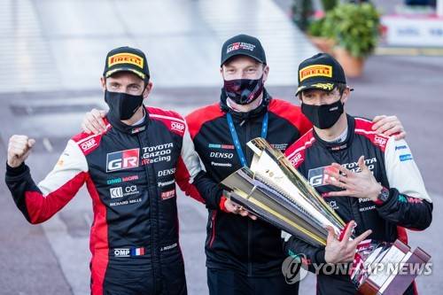 epa08963628 Sebastien Ogier (R) of France and his co-driver Julien Ingrassia (L) pose with the trophy after winning the Rally Monte Carlo 2021 as part of the FIA World Rally Championship (WRC) in Gap, France, 24 January 2021 (reissued on 25 January 2021). EPA/Reporter Images