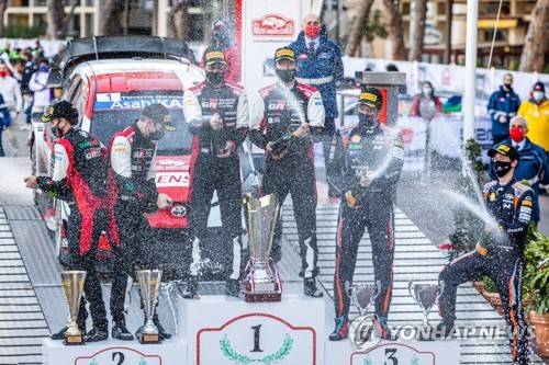 epa08963636 Sebastien Ogier (C-R) of France and his co-driver Julien Ingrassia (C-L) pose on the podium after winning the Rally Monte Carlo 2021 as part of the FIA World Rally Championship (WRC) in Gap, France, 24 January 2021 (reissued on 25 January 2021). Ogier won ahead of second placed Elfyn Evans (2-L) and Scott Martin (L) of Britain and third placed Thierry Neuville (2-R) and Martijn Wydaeghe (R) of Belgium. EPA/Reporter Images