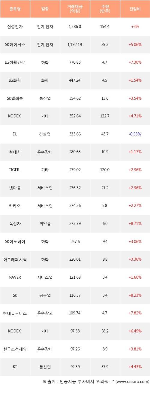 삼성전자, SK하이닉스, LG생활건강 등은 전일 대비 주가가 상승했고, DL 등은 주가가 하락했다.