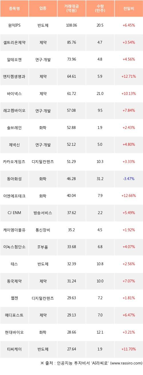 원익IPS, 셀트리온제약, 알테오젠 등은 전일 대비 주가가 상승했고, 동아화성 등은 주가가 하락했다.