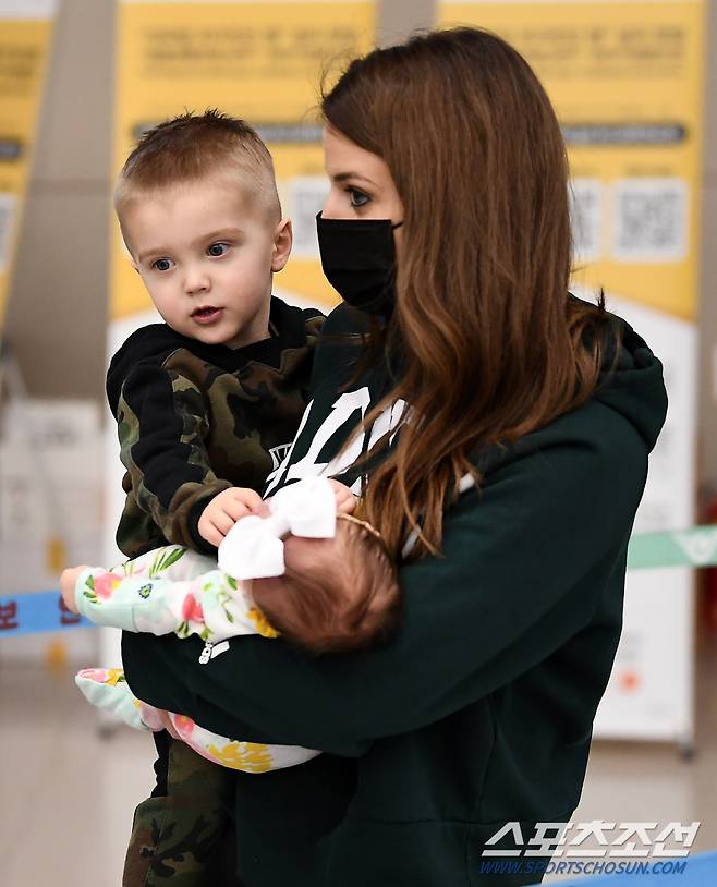삼성 라이온즈 외국인 투수 뷰캐넌이 가족과 함께 25일 인천국제공항을 통해 입국했다. 뷰캐넌의 딸이 엄마 품에 안겨 자고 있다. 인천공항=박재만 기자 pjm@sportschosun.com/2021.01.25/