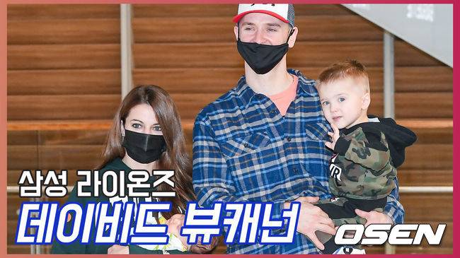 삼성 뷰캐넌이 가족과 함께 입국장을 나가며 취재진을 향해 포즈를 취하고 있다./ksl0919@osen.co.kr