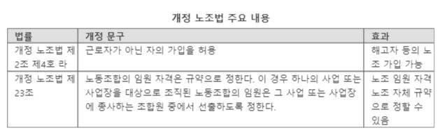 이어 "노조 임원 자격의 경우 개정 노조법 제23조를 통해 자체규약으로 자유롭게 정할 수 있게 된다"며 "다만 우리나라의 특수성 등을 고려해 기업별 노조에 한해 노조 임원은 그 회사에 종사하는 조합원으로 제한했다"고 설명했다.