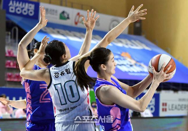 삼성생명 윤예빈(오른쪽)이 5일 용인체육관에서 열린 2020-2021 여자프로농구 삼성생명과 하나원큐의 경기에서 리바운드를 잡아내고 있다. 2021. 1. 25.