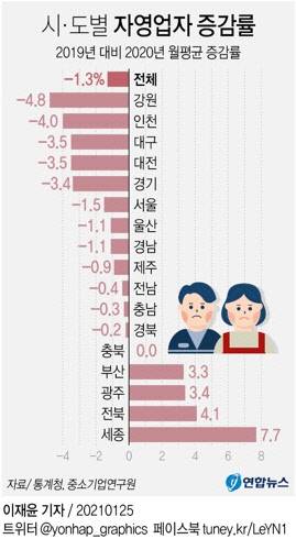 자영업자 감소율은 강원도(-4.8%)가 높았다. 이어 인천(-4.0%), 대구(-3.5%), 대전(-3.5%), 경기(-3.4%), 서울(-1.5%) 등의 순이었다.