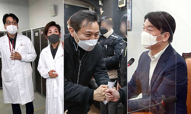 | ‘빅3’ 동분서주 국민의힘 나경원 전 의원(왼쪽부터)이 25일 경기 성남시 SK바이오사이언스 판교 본사를 방문해 관계자의 설명을 듣고 있다. 오세훈 전 서울시장이 이날 서울 양천구의 한 배달업체를 찾아 라이더들과 인사를 나누고 있는 모습. 이날 국회에서 열린 최고위원회의에서 발언하는 국민의당 안철수 대표. 국회사진기자단·뉴스1·허정호 선임기자 |