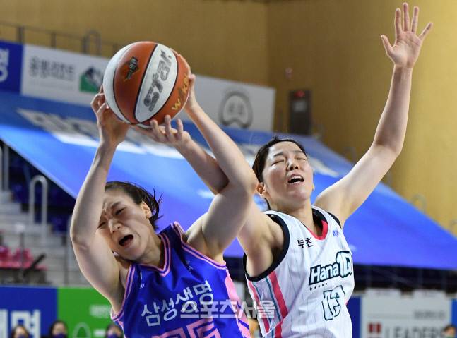 삼성생명 배혜윤(왼쪽))이 5일 용인체육관에서 열린 2020-2021 여자프로농구 삼성생명과 하나원큐의 경기에서 하나원큐 양인영에 앞서 리바운드를 잡아내고 있다. 2021. 1. 25.
