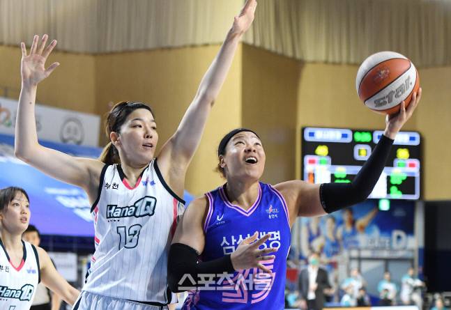 삼성생명 김한별(오른쪽)이 5일 용인체육관에서 열린 2020-2021 여자프로농구 삼성생명과 하나원큐의 경기에서 하나원큐 양인영의 수비를 피해 슛을 하고 있다. 2021. 1. 25.