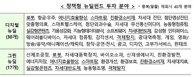 발표자료에 의하면 한국판 뉴딜펀드는 5년간 총 20조원 규모의 정책형 뉴딜펀드 형태로 조성돼 뉴딜투자 공동기준에 따라 로봇, 항공·우주 등 40개 뉴딜 투자분야에 투자한다.