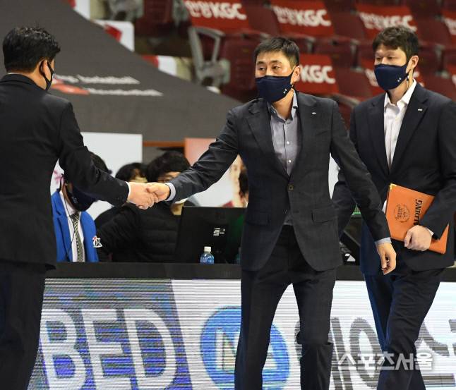 서울 삼성 이상민 감독이 25일 경기도 안양실내체육관에서 진행된 KGC와의 경기에서 66-96으로 패한 뒤 김승기 감독과 악수하고있다. 2021.01.25. 김도훈기자 dica@sportsseoul.com