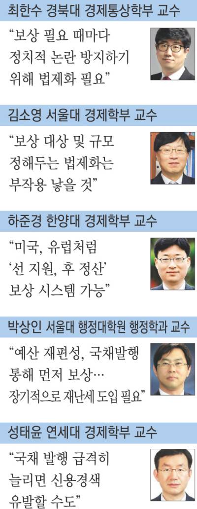 반면 최한수 경북대 경제통상학부 교수는 구체적 내용은 시행령에 위임하더라도 보상 근거 규정을 법으로 정하자고 말했다. “코로나19 장기화가 예상되는 시점에서 보상이 필요할 때마다 불필요한 정치적 논란이 일어나는 것을 방지한다는 측면에서 법제화가 바람직하다”는 것이다.
