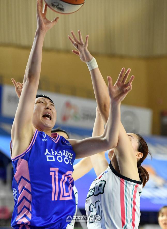 [포토]힘겹게 슛 올려놓는 삼성생명 김한비