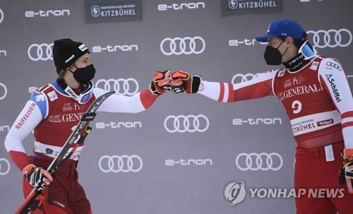 epa08963900 Third placed Matthias Mayer of Austria (R) and second placed Marco Odermatt (L) of Switzerland celebrate after the men's Super G race of the FIS Alpine Skiing World Cup event in Kitzbuehel, Austria, 25 January 2021. EPA/CHRISTIAN BRUNA