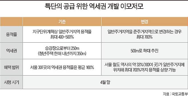 도심 고밀도 개발은 입지 좋은 지역을 더 높고 빽빽하게 활용하겠다는 것이다. 역세권은 대중교통을 이용하기 쉽고 도심 업무지역과 가까워 직주근접을 원하는 주택 수요자를 만족시킬 수 있는 입지다. 정부 입장에서도 택지 개발 같은 대형 사업 없이 주택 공급을 늘릴 수 있는 수단이기도 하다. 현재 서울 307곳의 역세권 용적률은 평균 160% 수준이다. 1월 19일 국토교통부(이하 국토부)는 국무회의에서 역세권 복합용도개발 지구단위계획 구역에 일반주거지역을 포함하고 지구단위계획으로 일반주거지역을 준주거지역으로 변경할 경우 용적률을 최대 700%까지 높이는 내용이 핵심인 ‘국토의 계획 및 이용에 관한 법률 시행령’ 일부 개정안을 의결했다. 그동안 일반주거지역은 지구단위계획으로 용적률을 최대 400~500%까지 높일 수 있었다. 새 시행령을 통해 고밀도 개발이 가능해진 셈이다. 국토부에 따르면, 서울시 철도 역사의 33%(100여 곳)가 일반주거지역 인근에 있다.