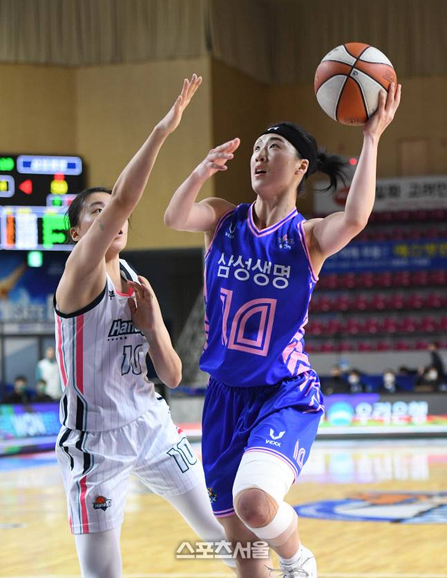 삼성생명 김한비(오른쪽)가 5일 용인체육관에서 열린 2020-2021 여자프로농구 삼성생명과 하나원큐의 경기에서 하나원큐 강유림의 수비를 피해 슛을 하고 있다. 2021. 1. 25.