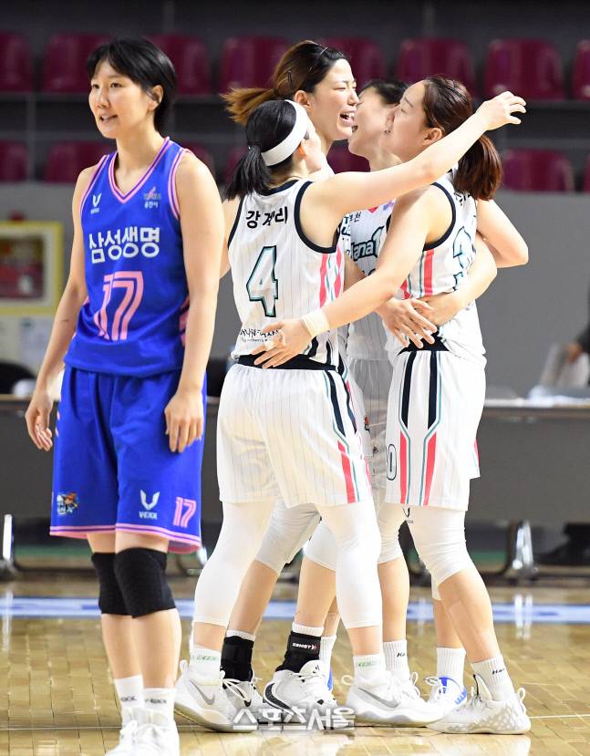 하나원큐 선수들이 5일 용인체육관에서 열린 2020-2021 여자프로농구 삼성생명과 하나원큐의 경기에서 1차 연장 승부 끝에 삼성생명에 91-88로 승리하면서 함께 기뻐하고 있다. 하나원큐는 9연패에서 탈출했다. 2021. 1. 25.