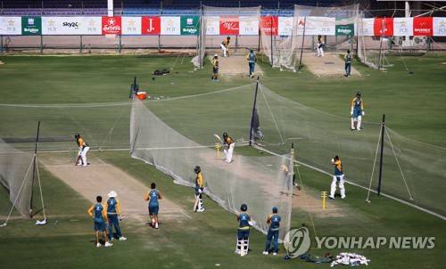 epa08964089 Pakistani cricketers attend a practice session ahead of the Cricket Series with visiting South African cricket team in Karachi, Pakistan, 25 January 2021. The South African cricket squad arrived in Pakistan for their first tour consisting of two Test and three T20 matches after a 14-year break. EPA/SHAHZAIB AKBER