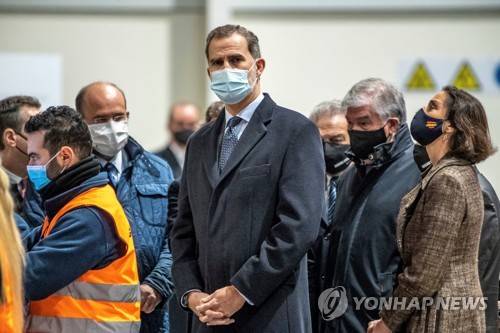 epa08964160 Spanish King Felipe VI (C) attends the opening of the new logistics center of SEUR in Illescas, Toledo, Spain, 25 January 2021. EPA/Ismael Herrero / POOL