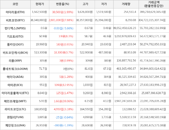 또한, 아이콘(12.95%, 951원), 기프토(8.3%, 50.9원), 비트코인캐시(3.7%, 513,300원), 라이트코인(3.18%, 160,850원), 이더리움(1.99%, 1,562,500원), 이더리움클래식(1.47%, 8,640원), 에이다(1.28%, 395원), 리플(0.99%, 305원), 폴카닷(0.91%, 19,960원)이 상승세를 나타냈다.