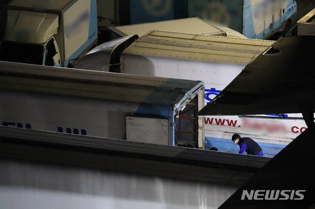 [서울=뉴시스]박민석 기자 = 오후 9시 이후 심야 택배 배송 제한 조치가 시행되고 있는 25일 서울 시내의 한 택배 물류센터에서 한 택배노동자가 작업을 하고 있다. 2021.01.25. mspark@newsis.com