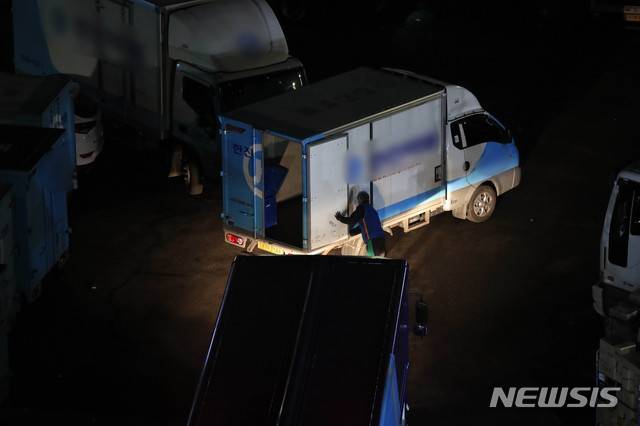 택배 차량 문 닫는 노동자