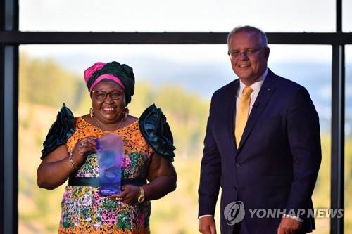 epa08964244 Australian Prime Minister Scott Morrison (R) with 2021 Local Hero winner Rosemary Kariuki during the 2021 Australian of the Year Awards at the National Arboretum in Canberra, Australian Capital Territory, Australia, 25 January 2021. EPA/MICK TSIKAS AUSTRALIA AND NEW ZEALAND OUT