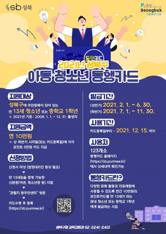 [아시아경제 박종일 기자] 성북구(구청장 이승로)는 2월1일부터 ‘2021년 성북구 아동·청소년 동행카드’ 발급을 시작한다.