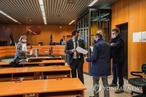 epa08964319 Italian Lega party leader Matteo Salvini (3-L) in the courtroom to face the trial for insulting magistrates in Turin, Italy, 25 January 2021. Senator Matteo Salvini arrived in court in Turin to attend the hearing of the trial in which he is accused of insulting the judicial order. After entering the courtroom, he signed the anti-covid self-certification required for anyone entering the Palace of Justice. EPA/TINO ROMANO