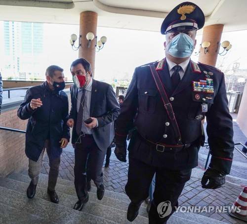epa08964318 Italian Lega party leader Matteo Salvini (2-L) arrives at Justice Palace in the courtroom to face the trial for insulting magistrates in Turin, Italy, 25 January 2021. Senator Matteo Salvini arrived in court in Turin to attend the hearing of the trial in which he is accused of insulting the judicial order. After entering the courtroom, he signed the anti-covid self-certification required for anyone entering the Palace of Justice. EPA/JESSICA PASQUALON