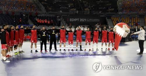 epa08964330 Players of Bahrain listen to their national anthem before the Main Round match between Bahrain and Japan at the 27th Men's Handball World Championship in Cairo, Egypt, 25 January 2021. EPA/Mohamed Abd El Ghany / POOL