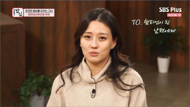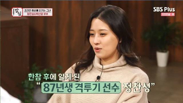 박선영은 '꿈'을 묻는 질문에 "정찬성 지키기'라고 답했다. 그는 "친구랑 같이 하다가 체육관을 혼자 하게 됐는데 조제 알도에게 졌다. 큰 수술도 하게 됐다. 그런게 같이 오니까 정신적으로 이기지를 못하더라. 한 번은 울면서 '죽고 싶다'고 했다. 그 얘기를 듣는데 '내가 꼭 지켜줘야겠다'고 생각했다. 모두에게 비난 받더라도 '이 사람이 꿈을 이루는 날까지 무슨 일이 있어도 지켜주자'라는 생각에 결혼도 마음 먹게 됐다"라고 말했다.