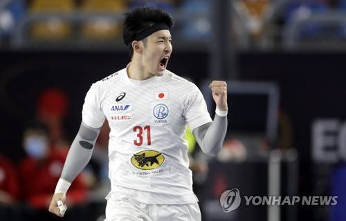 epa08964384 Tatsuki Yoshino of Japan celebrates after scoring during the Main Round match between Bahrain and Japan at the 27th Men's Handball World Championship in Cairo, Egypt, 25 January 2021. EPA/Petr David Josek / POOL