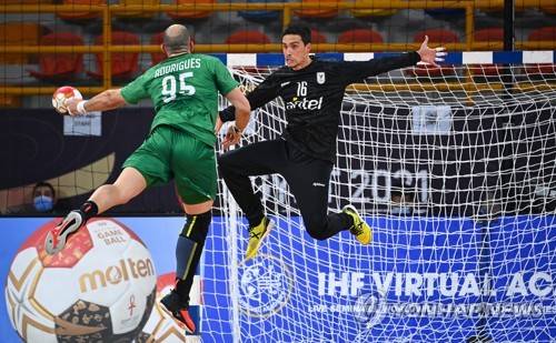 epa08964407 Gustavo Rodrigues (L) of Brazil in action against goalkeeper Felipe Alfonso Gonzalez Alloza of Uruguay during the Main Round match between Brazil and Uruguay at the 27th Men's Handball World Championship in Cairo, Egypt, 25 January 2021. EPA/Anne-Christine Poujoulat / POOL