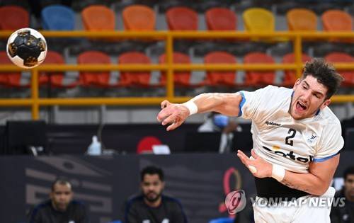 epa08964410 Gabriel Chaparro Almada of Uruguay in action during the Main Round match between Brazil and Uruguay at the 27th Men's Handball World Championship in Cairo, Egypt, 25 January 2021. EPA/Anne-Christine Poujoulat / POOL