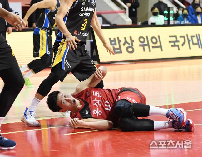안양 KGC 오세근이 25일 경기도 안양실내체육관에서 진행된 삼성과의 경기에서 코트에 쓰러져 몸을 피하고있다. 2021.01.25. 김도훈기자 dica@sportsseoul.com