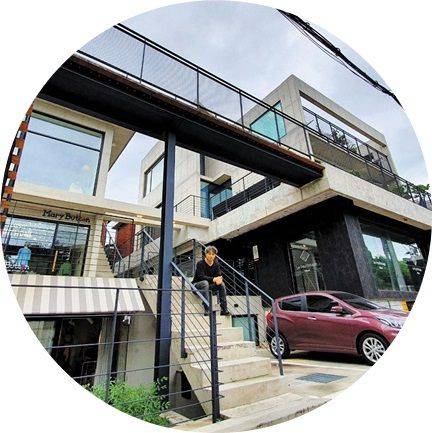 먼저 기존 건물은 2층에서 4층으로 2개층 더 올렸다. 비어있던 앞마당에는 지하 1층~지상 2층 건물을 새로 지었다. 건폐율을 거의 60%까지 다 확보했다. 두 건물은 공중 노출형 계단으로 연결했다. 김 소장은 “대부분 상가에선 계단실을 엘리베이터와 함께 건물 내부에 폐쇄적으로 배치하는데, 지나다니는 고객들이 쉽게 들어오게 하려면 노출형 계단이 효과적”이라며 “외벽에 설치한 계단이 사선 형태를 띠기 때문에 건물이 실제보다 더 높아보이는 효과도 낼 수 있다”고 했다. 독특한 외관과 노출형 계단은 세입자들에게 큰 인기를 끌었다. 신종 코로나바이러스 감염증 여파로 상업용 부동산 시장이 침체돼 있지만, 이 건물 6개 점포는 꽉 들어찼다. 개인용 책을 만드는 책공방, 꽃집, 언더웨어 쇼룸 등 고급 이미지의 점포가 입점했다. 임대수익은 매년 1억원 넘게 나온다.