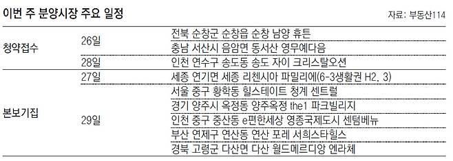 27일 금호건설과 신동아건설이 분양하는 '세종 리첸시아 파밀리에'를 시작으로 29일 서울 중구 '힐스테이트 청계 센트럴', 경기 양주시 '양주 옥정 the1 파크빌리지' 등 5곳이 개관한다.