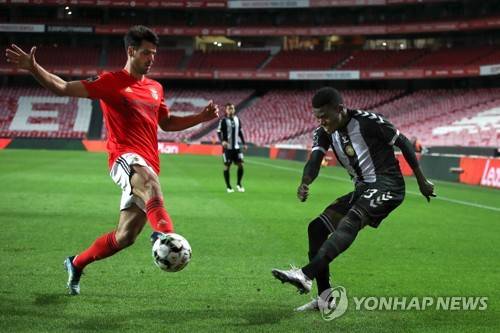 epa08965051 Benfica's Gabriel (L) in action against Witi (R) of Nacional during the Portuguese First League soccer match between Benfica Lisbon and Nacional Funchal at Luz stadium in Lisbon, Portugal, 25 January 2021. EPA/MANUEL DE ALMEIDA
