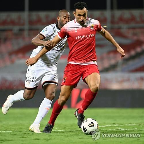 epa08965090 Al-Wehda's player Pedro Henrique (R) in action against Al-Shabab's Seba (L) during the Saudi Professional League soccer match between Al-Wehda and Al-Shabab at King Abdulaziz Stadium, Mecca, Saudi Arabia, 25 January 2021. EPA/STR
