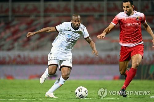 epa08965093 Al-Wehda's player Pedro Henrique (R) in action against Al-Shabab's Seba (L) during the Saudi Professional League soccer match between Al-Wehda and Al-Shabab at King Abdulaziz Stadium, Mecca, Saudi Arabia, 25 January 2021. EPA/STR
