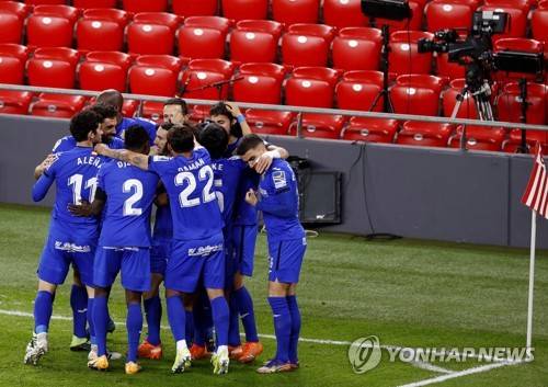 epa08965207 Getafe's midfielder Marc Cucurella (C) celebrates with teammates after scoring the 1-0 lead during the Spanish LaLiga soccer match between Athletic Club Bilbao and Getafe CF held at San Mames Stadium, in Bilbao, Basque Country, northern Spain, 25 January 2021. EPA/LUIS TEJIDO
