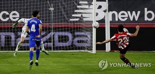 epa08965209 Athetic Bilbao's midfielder Raul Garcia (R) scores the 1-1 goal during the Spanish LaLiga soccer match between Athletic Club Bilbao and Getafe CF held at San Mames Stadium, in Bilbao, Basque Country, northern Spain, 25 January 2021. EPA/LUIS TEJIDO