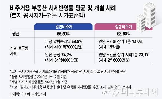 비주거용 부동산의 평균 시세반영률이 주거용 대비 크게 낮은 것은 아니다. 평균만 보면 감정가 기준(2019년 1~12월) 일반비주거 부동산 시세반영률이 66.5%, 집합비주거는 62.6%로 2020년 1월 기준 공동주택 시세반영률 69.0%보다 크게 낮지 않다. 같은 기간 전국 단독주택 시세반영률 53.6%보다는 오히려 높다.