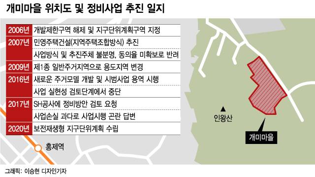 1960년대 말 홍제3동에 몰려든 지방 이주민들은 박정희 정권 시절 대규모 철거 사태를 겪다 1985년 토지불하를 받아 자기 땅을 소유하게 됐다. 2006년 개발제한구역에서 해제되면서 개발이 가능해졌고 이듬해 지역주택조합방식의 민영주택 건설이 추진됐지만 사업 방식 및 추진주체 불분명, 동의율 미확보 등으로 사업이 반려됐다.
