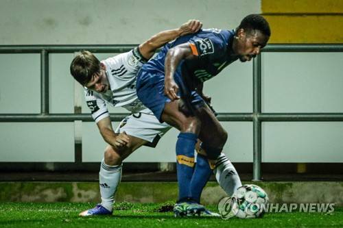 epa08965323 Farense player Ryan Gauld (L) fights for the ball with FC Porto player Wilson Manafa during the Portuguese First League soccer match between SC Farense and FC Porto held at Farense Stadium, Faro, Portugal, 25 January 2021. EPA/LUIS FORRA