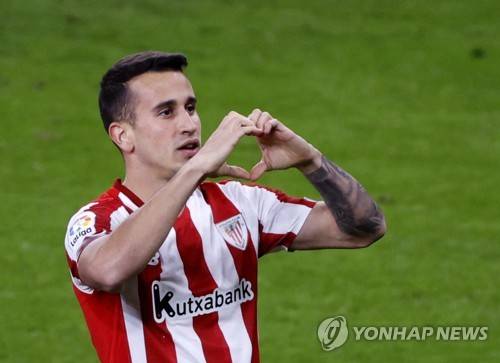 epa08965331 Athletic Bilbao's Alejandro Berenguer celebrates after scoring the 4-1 goal during the Spanish LaLiga soccer match between Athletic Club Bilbao and Getafe CF held at San Mames Stadium, in Bilbao, Basque Country, northern Spain, 25 January 2021. EPA/LUIS TEJIDO