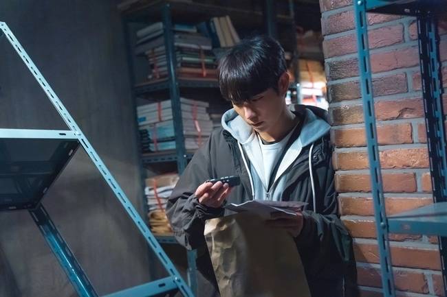 공개된 사진 속에는 넘어진 선반으로 어지러운 여주의 지하실에서 뭔가를 발견한 수호의 모습이 포착됐다. 수호는 봉투에서 발견한 검은 물체와 종이를 손에 들고 고민에 빠진 모습이다.