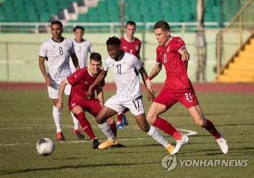 epa08965447 Serbian Alexa Pejic (R) vies for the ball with Dominican Dorny Romero (C) during a friendly match between Serbia and Dominican Republic, at the Felix Sanchez stadium, in Santo Domingo, Dominican Republic, 25 January 2021. EPA/Orlando Barria