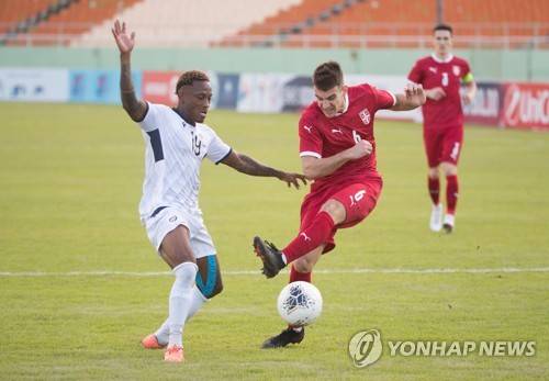 epa08965451 Serbian Jovan Nisic (C) vies for the ball with Dominican Wilman Modesta (L) during a friendly match between Serbia and Dominican Republic, at the Felix Sanchez stadium, in Santo Domingo, Dominican Republic, 25 January 2021. EPA/Orlando Barria