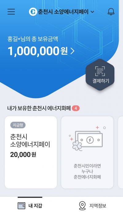 [아시아경제 차민영 기자] KT가 블록체인 기반 지역화폐 플랫폼인 착한페이를 통해 강원도 춘천시의 ‘소양에너지페이’를 제공한다고 26일 밝혔다. 그동안 지역경제 활성화 등을 위한 정책수당으로 지역화폐가 활용된 사례는 많지만 정책참여 인센티브로 지역화폐 플랫폼이 활용되는 것은 소양에너지페이가 처음이다.